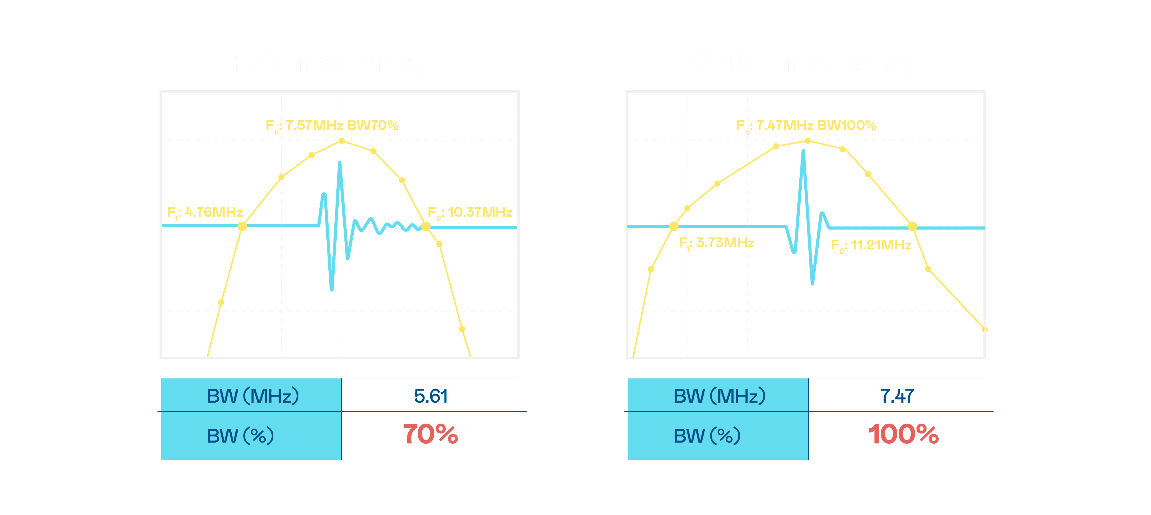 超音波影像的解析度高低,,,,首先取决于探头能发出的讯号频宽。。。尊龙集团 CMUT 可提供高清晰的超音波讯号,,,,提供高频宽、、高灵敏度、、影像纹理细节更高的超音波影像,,,协助医护人员缩短影像判读时间及利用精准的医疗影像进行诊断。。。